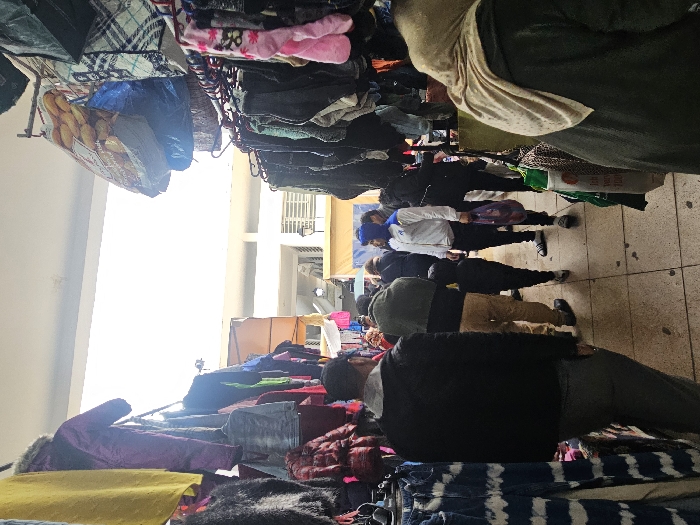 This image depicts a crowded, narrow, covered market passage in Salé, Morocco. The pathway is illuminated by an overhead light source, casting a bright white light on the upper parts of the scene, with a light-colored tiled or concrete floor below. Merchandise, primarily clothing and bags, is densely displayed on racks lining both sides of the passage, creating a tunnel-like effect. On the left side, items include a yellow garment, a purple winter jacket with a fur-trimmed hood, various other jackets, handbags, and blue-and-white patterned trousers or fabric. On the right, a large transparent plastic bag containing bread rolls or pastries hangs above racks displaying dark-colored clothing, pink patterned fabrics, and a checkered bag. Several shopping bags, including a blue plastic one and a white fabric bag with green text, are also visible. Multiple pedestrians are navigating the passage. In the immediate foreground on the left, a male subject is seen from the back, wearing a black jacket with a grey hood and grey trousers. In the immediate foreground on the right, a female subject, also seen from the back, wears a dark robe or coat and a light beige headscarf, holding a white shopping bag. Midground figures include a male in a white track jacket with blue accents, black trousers, and black slide sandals, wearing a blue head covering and carrying a purple plastic shopping bag. He is seen slightly turned to his right. Next to him, a small child in a dark outfit walks away from the camera, alongside an adult male in a green jacket and light brown trousers. Other individuals are present further down the aisle, their features less distinct due to distance and obstruction. People are actively walking through the market, indicating pedestrian traffic and commercial activity.