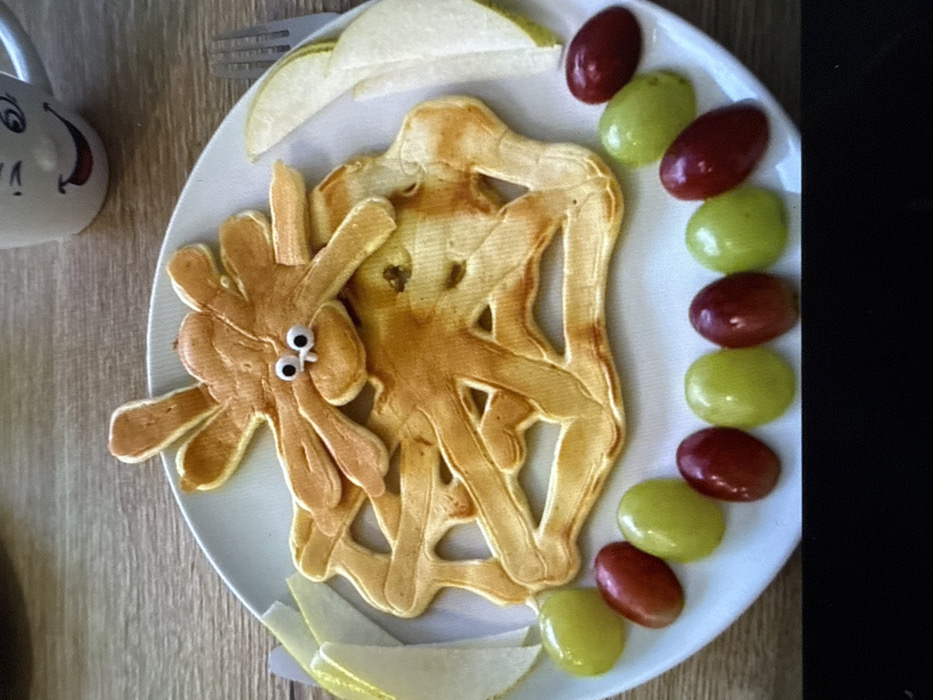 A white plate on a wooden surface holds a playful breakfast. Two giraffe-shaped waffles are stacked, one adorned with googly eyes. Pear slices are arranged above and below the waffles. A row of green and red grapes curves along the right side of the plate. A fork rests near the pears, and a mug with a smiling face is partially visible on the left.
