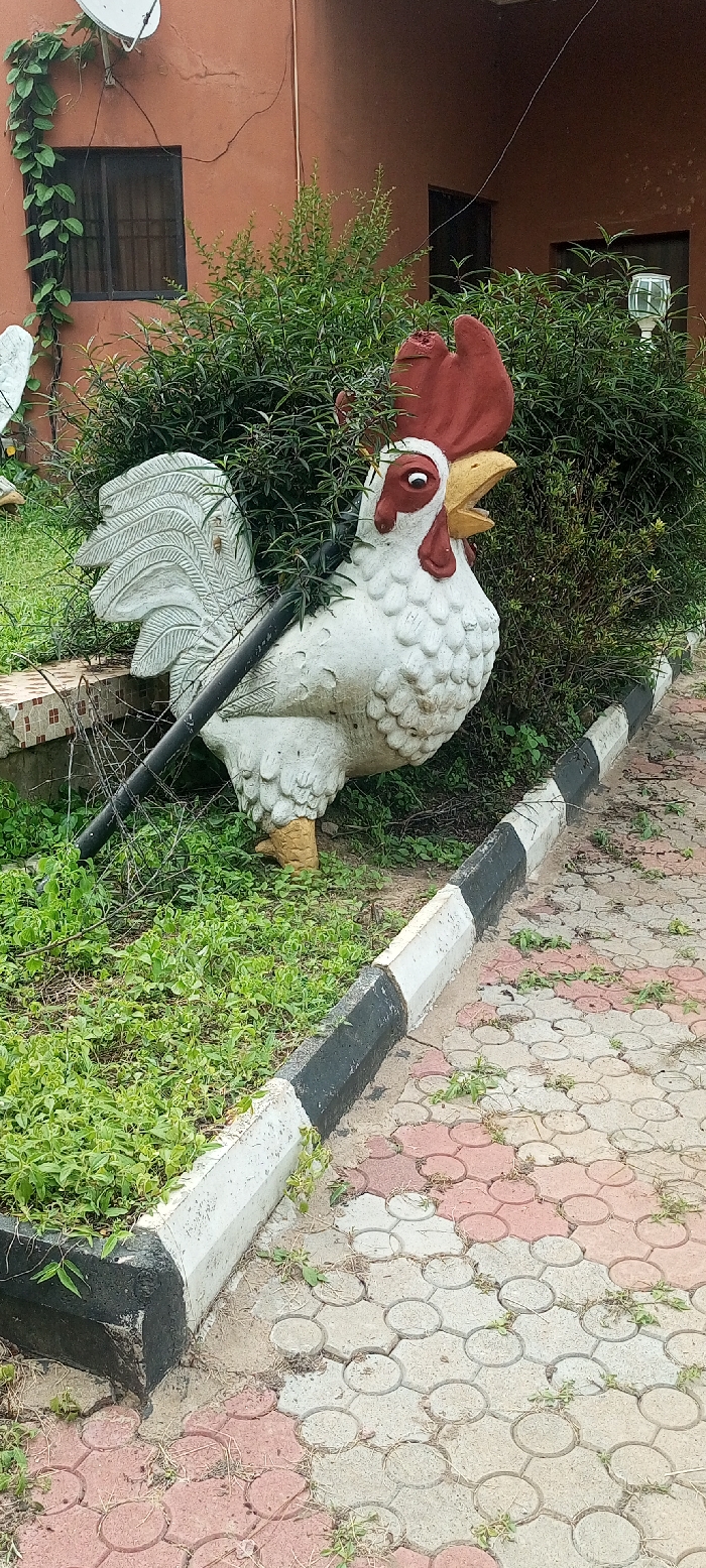The image depicts an outdoor scene in Ila Orangun, Nigeria, focusing on a large, prominent statue of a rooster