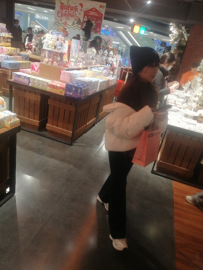 The image depicts an indoor retail environment, specified as being within Dongcheng District, China. The flooring is composed of dark gray square tiles. In the immediate foreground, a female subject walks from left to right. She wears a dark knit beanie, a brown long-sleeved top, a white puffer jacket, black trousers, and white athletic shoes. She carries a pink shopping bag, inscribed with "WOW COUNTRY" in white text, in her right hand. To her left, a series of wooden display tables with dark metal frames are laden with rows of packaged goods and small decorative items. Above these displays, a red and white banner featuring the text "圣诞快乐 Christmas" is prominent, accompanied by various Christmas decorations including miniature trees and figurines. In the mid-ground to the right of the central subject, two individuals are observed examining merchandise on a white display counter; one wears a dark top, the other an orange top. Multiple indistinct figures are visible in the background, with an escalator and a "4F" sign (indicating the fourth floor) confirming a multi-level retail establishment. The scene is brightly lit by overhead fixtures and localized display lighting.
