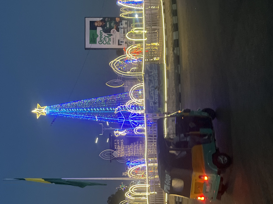 An illuminated Christmas tree stands tall against a twilight sky, adorned with blue lights and a prominent star at its peak. Elaborate, glowing decorations surround the tree, including arches and other festive designs. A flag is visible on the left. A billboard for "Green City Park" is above the decorations. In the foreground, a three-wheeled vehicle is parked on the roadside.