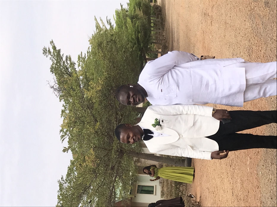 The scene is an outdoor setting in Nabatum, Nigeria, under an overcast sky. Two adult males stand prominently in the foreground on an unpaved, reddish-brown dirt surface. The male on the left, with a dark complexion and short dark hair, wears a white textured tuxedo jacket, a black bow tie, a white shirt, and black trousers. A white boutonniere with green foliage is affixed to his left lapel. He wears a gold-toned watch on his left wrist and holds a black smartphone in his left hand, resting it against his thigh. He is smiling and looking towards the left. The male on the right, also with a dark complexion and short dark hair, wears a white traditional tunic top with a chest pocket and matching white trousers. A white earbud is present in his right ear. He is smiling and looking towards the right, with his hands positioned behind his back. In the mid-ground, to the left of the primary subjects, a woman with dark complexion and long dark hair is visible, wearing a long, bright lime-green or chartreuse dress. She stands near a light-colored building with a green-framed window and appears to be holding a smartphone with both hands, raised. Partially obscured to her immediate left is another individual in dark attire. The background consists of numerous trees with green and yellowing foliage, forming a dense canopy across the upper frame and extending in a line to the right.