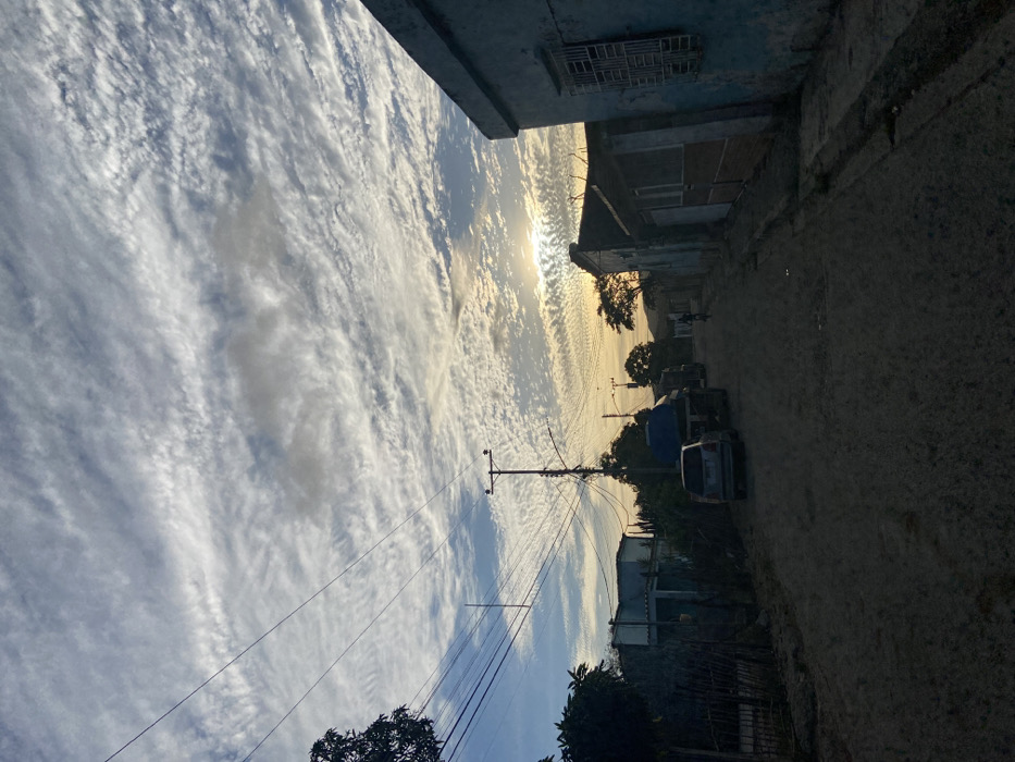An outdoor scene in Juan Griego, Venezuela, depicts a residential street at either sunrise or sunset. The sky features extensive white and grey altocumulus clouds, displaying a rippled, textured pattern across the frame. The sun, a bright luminous disc, is low on the horizon towards the right-center, casting a warm, golden glow on the distant clouds and landscape. The unpaved, dirt road occupies the lower portion of the image, appearing dark in the foreground due to shadowing, and recedes into the distance. On the right side, a light blue building with a white security grate over a window is visible. Further down, other modest structures line this side of the road. On the left side, residential buildings are partially obscured by dense green foliage and a rudimentary wooden fence. Overhead, a complex network of black power lines extends horizontally across the upper-left sky, converging towards a prominent utility pole positioned on the left side of the road in the mid-ground. Additional, smaller utility poles are visible further down the street. Parked on the left side of the road, a light-colored sedan is visible, with a darker, larger vehicle (possibly a truck with a blue tarp-covered bed) behind it. A single individual is discernible in the distance, riding a bicycle away from the viewer down the center of the road. The overall lighting suggests a transition period of day, with the foreground in shadow and the background illuminated by the low sun.
