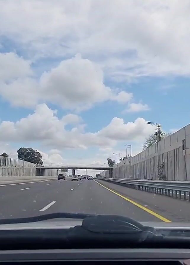 car driving down a highway on a partially cloudy day. The road has multiple lanes with yellow and white lane markings. A concrete wall lines the right side of the highway, while the left side is bordered by a fence and buildings in the distance. Overhead, a bridge spans the highway. Other cars are visible in the distance.