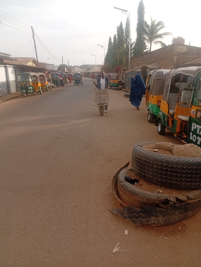 A street scene features a man pushing an empty wheelbarrow toward the camera. Several three-wheeled vehicles are parked along the roadside. A woman in a blue garment walks along the street. A stack of old tires filled with dirt sits near the foreground. The setting appears to be a residential or commercial area with buildings and trees visible in the background.