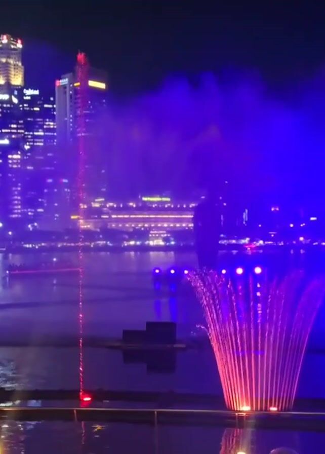 water fountain show at night with the Singapore skyline in the background