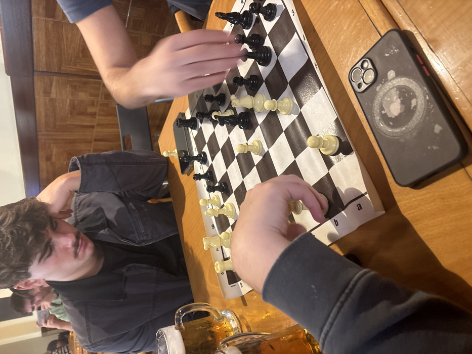 Two people are playing chess. A man in a dark jacket rests his head on his hand, watching the game unfold. Two glasses of beer sit on the table near him. A phone lies next to the chessboard. One player is about to move a white pawn, while the other has their hand poised above the board, ready to respond. The chessboard has white and black pieces arranged in a mid-game position.