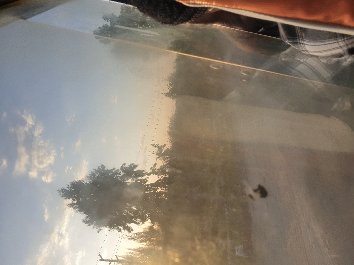 A view from inside a vehicle, likely a car, shows the outside world obscured by the hazy glass. The sky is visible with wispy clouds and a setting sun. Silhouetted trees and power lines dot the landscape. Part of a person wearing an orange shirt and plaid shirt is visible in the upper right. A dark, undefined blemish appears on the interior of the glass, interrupting the view.