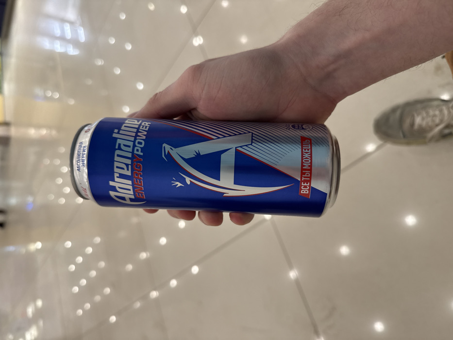 A blue energy drink can, labeled "Adrenaline ENERGY POWER" with a stylized "A" logo, is held by a hand. The background features a light-colored, glossy floor with blurred reflections of lights. A blurred shoe is visible in the background. The can also has text in Cyrillic, "АБСОЛЮТНАЯ ЭНЕРГИЯ" and "ВСЕ ТЫ МОЖЕШЬ".