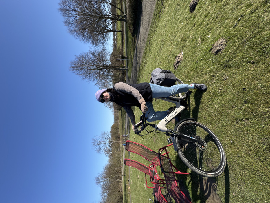 In an outdoor park or green space within Witten, Germany, a female is depicted on a sunny day. She wears a light purple beanie, dark sunglasses, a black vest over a light brown long-sleeved shirt, light blue jeans, and dark athletic shoes, with a visible patterned sock on her right ankle. She sits on a light beige Fischer-branded electric bicycle, holding its handlebars with gloved hands. A grey pannier bag is affixed to the rear rack. Her left foot rests on the ground, while her right foot is on a pedal. To the left, two unoccupied red metal lounge chairs are positioned on a grassy incline. A paved path curves through the midground, flanked by green grass containing several molehills and numerous bare deciduous trees. The background features a clear blue sky.