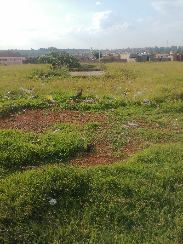 A grassy field littered with trash extends towards a cityscape under a partly cloudy sky. A large bird stands amidst the trash. The foreground features patches of bare, reddish soil. The grass transitions from shorter to taller towards the bottom of the frame. A tree and possibly a pond are in the middle distance, before the low-rise buildings of the city.