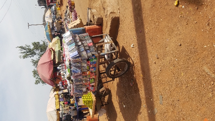 This image depicts an active outdoor market scene on unpaved, reddish-brown earth, characteristic of a market in Jos, Nigeria. In the foreground, a two-wheeled wooden pushcart, approximately 1.5 meters long, is positioned centrally. The cart's left side displays numerous mobile phone cases, individually packaged in clear plastic, arranged vertically in multiple rows and columns. The right side of the cart's platform holds a light brown basket containing a pile of green, spherical fruits, likely garden eggs or small limes. A white bag or object is visible underneath the cart between its dark-spoked wheels. The ground is dusty and uneven, with small debris and prominent shadows cast from the cart and other unseen objects, indicating bright overhead sunlight. In the midground, behind the pushcart, a bustling market area is visible. Multiple vendors operate under large, multicolored umbrellas (red, beige, light blue, and green) that provide shade. Several individuals are present; some are seated, others stand, engaging in transactions or tending to their stalls. To the right of the main cart, on the ground, a large mound of red onions is piled. Various market items, including cardboard boxes, blue and orange plastic containers, and other produce, are scattered across the ground. A dark blue table with items on it is partially visible to the left. The background shows further extensions of the market. Tall green trees are visible against a light sky with scattered clouds. Utility poles and overhead wires are present on the right. Distant, indistinct structures and a vehicle are discernible, suggesting a path or road beyond the immediate market area. The overall scene is open-air, vibrant, and sunlit, with a high concentration of goods and people.
