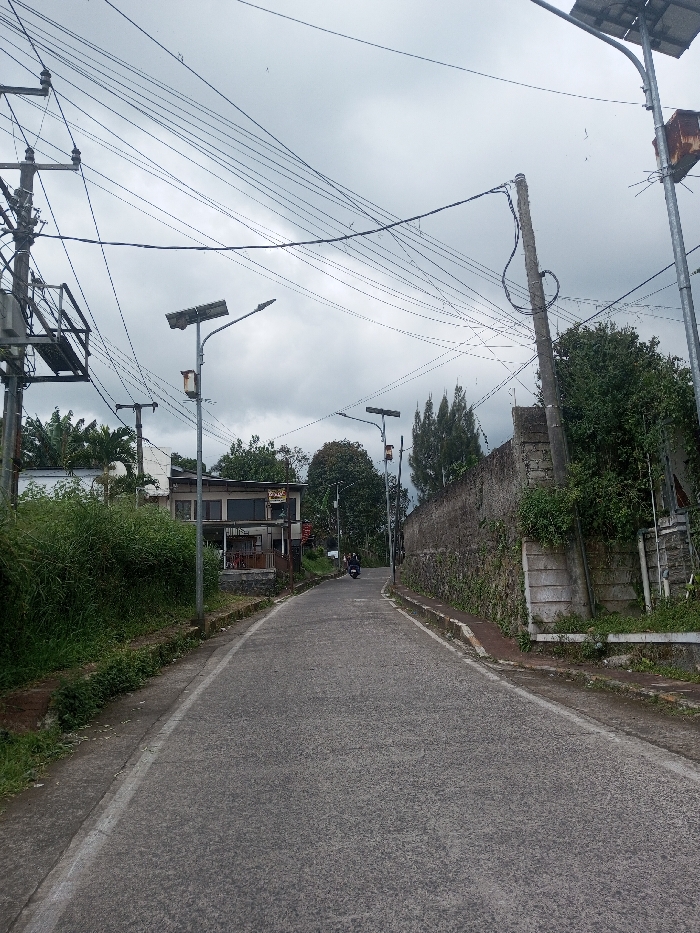 The image depicts an uphill paved road in Zeyathiri District, Myanmar, under an overcast sky. The road, featuring white edge markings, recedes into the distance. On the left side, a dense growth of green bushes borders the road, behind which a two-story building with a dark roof and prominent windows is visible. A utility pole with a transformer and numerous tangled electrical wires stands on the left. Further up the road on the left, a solar-powered street light with a gray panel and a brown control box is erected. On the right side, a concrete wall topped with irregular stone blocks runs parallel to the road, partially obscured by overgrown vegetation. Another solar-powered street light, similar in design, is positioned along the right side of the road. A second utility pole with wires is also visible on the right. In the distance, approximately midway up the road, a dark-colored scooter with a single rider is observed heading away from the viewer.