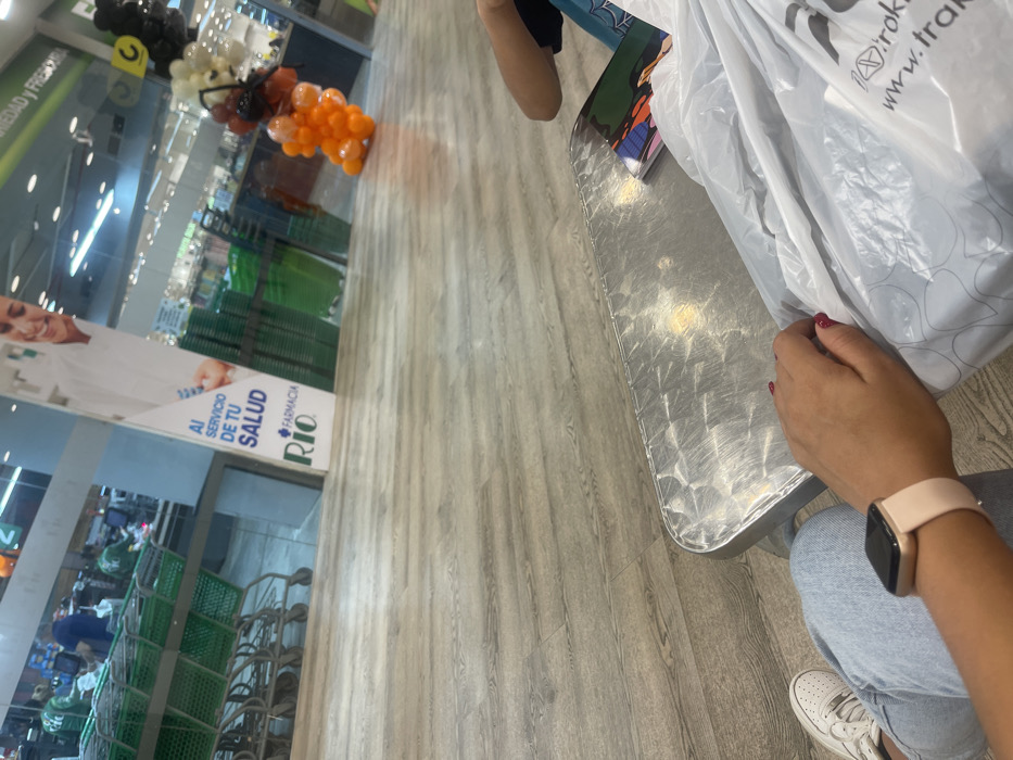 The scene captures an interior view of a retail establishment in Porlamar, Venezuela, specifically a location housing Farmacia Rio. In the foreground, a person's left leg, clad in light-wash denim jeans and a white sneaker, is visible. Their right hand, wearing a pink smartwatch and displaying red nail polish, rests on a white plastic shopping bag, which features partial "Trok" and "www.tra" branding, consistent with Traki stores. This hand is positioned on a reflective, brushed metallic surface, likely a table or bench. To the right, another individual's arm and a colorful magazine are partially visible. The floor is light-toned, wood-grain laminate. The background, viewed through a clear partition, reveals a bustling retail area. Stacked green shopping carts are on the left. Multiple individuals, some in blue or green uniforms, are visible at checkout counters. A tall, vertical sign advertising "FARMACIA RIO" with the slogan "AL SERVICIO DE TU SALUD" is prominent. A decorative cluster of orange, brown, and black balloons stands to the right of the sign, near more green shopping baskets.