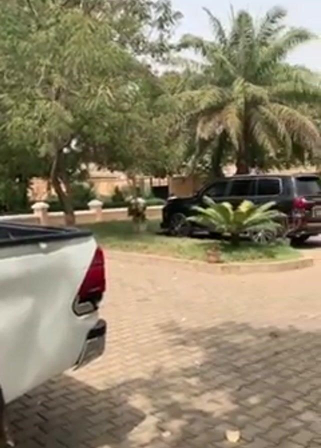 The camera pans across a paved area to reveal several parked vehicles and a motorcycle in a landscaped yard