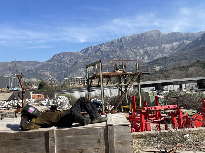 The scene depicts an outdoor industrial yard located in Tomba, Montenegro, under a clear blue sky with minimal wispy clouds. A prominent, rugged mountain range with sparse vegetation dominates the background. In the foreground, a single individual is lying on their back on a stack of large, light-colored wooden crates. This person is dressed in dark trousers, dark work boots, a dark brown/olive-green welding jacket, and a black welding helmet with the visor down, exhibiting a magenta reflection. Their hands are clasped behind their head. To the immediate right of the individual, numerous red-painted metal components, consistent with machinery parts, are arranged on the ground. The midground features various industrial elements including piles of scrap metal, a tall, rusty, inverted V-shaped metal structure, and a multi-level gantry constructed from green and brown painted metal, which includes a top platform with visible machinery and an access staircase. Further back, several single-story industrial buildings with corrugated siding are visible, with a light-colored vehicle (possibly a white SUV) partially parked near one of them. The distant background reveals a large mountain range characterized by steep, rocky, and sparsely vegetated slopes, with a multi-story residential building discernible on a lower mountain slope.