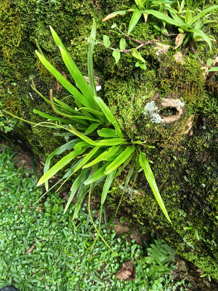 This image displays a close-up, elevated view of dense green vegetation in Munyati, Zimbabwe. A central cluster of bright green, strap-shaped plant leaves, approximately 10-15 cm in length, grows from a robust layer of vibrant green moss. This moss heavily blankets a textured, dark brown substrate, consistent with a tree trunk or large rock. Smaller green plants and thin vines are interwoven throughout the moss. A distinct circular cavity is visible within the moss-covered surface, accompanied by patches of white and light blue lichen. The lower left quadrant of the scene reveals ground cover composed of small-leafed green grass and clover-like plants. No individuals, actions, or interactions are present.