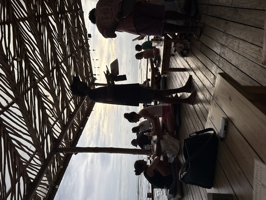 The image depicts an open-air, beachfront restaurant or lounge located in Ahangama, Sri Lanka, at either sunrise or sunset, evidenced by the bright, backlighting from the horizon over a cloudy sky. The establishment features a wooden deck floor and a rustic canopy constructed from woven natural branches or strips of wood, beneath which string lights with exposed bulbs are suspended. The seating consists of low wooden tables paired with floor cushions, positioned directly adjacent to the ocean, with waves visible breaking near the deck's edge. Approximately ten individuals are present, mostly silhouetted or dimly lit. In the mid-ground, a barefoot male, appearing to be a server, stands in a dark t-shirt, dark shorts, and a cap, holding an open menu or order pad. To his right, another barefoot male, of larger build, stands wearing a light-colored t-shirt with a graphic design and light shorts, holding a flat object, possibly another menu or tray. Patrons are seated around the low tables on floor cushions. To the left, two females are seated, one in a dark tank top and the other in a white top and pink skirt, engaged in conversation or reviewing items. Further back, additional indistinct figures are seated. Objects on the tables include glasses, bottles, and plates, indicating dining and drinking. In the immediate foreground, a dark shoulder bag rests on the wooden deck, and a white rectangular electronic device is visible on a table. The scene suggests a relaxed, casual dining or social environment by the sea.