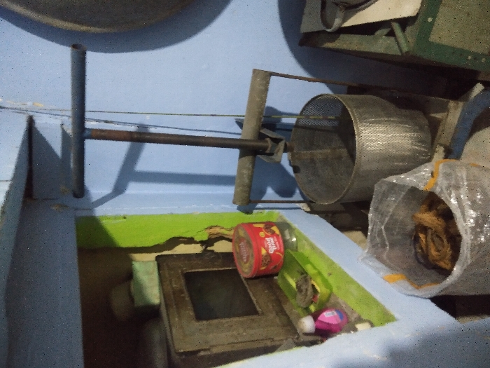 This image depicts an indoor utility area in Turmero, Venezuela. The scene is dominated by a blue-painted wall and a built-in, blue-painted shelf structure on the left, which contains a niche with a bright green interior. The green paint shows visible cracking and damage. Within the niche, a rectangular, dark-colored object resembling a small metal door or frame is present. On the shelf directly below the niche, a red cylindrical container labeled "Good Time" (chocolate flavored) is visible, alongside a green plastic tray and a small pink bottle. Central to the image is a manual metal press device. It features a dark metal frame with vertical supports and a horizontal crossbar, beneath which a cylindrical, mesh-textured metal basket is positioned. A central vertical rod extends into the basket from above. On the floor in the foreground, a large, clear plastic bag contains a quantity of dark brown, curled, fibrous material, resembling dried plant matter. The overall environment appears utilitarian and shows signs of wear, consistent with a functional workspace. No individuals are visible, and no active interactions or actions are depicted.