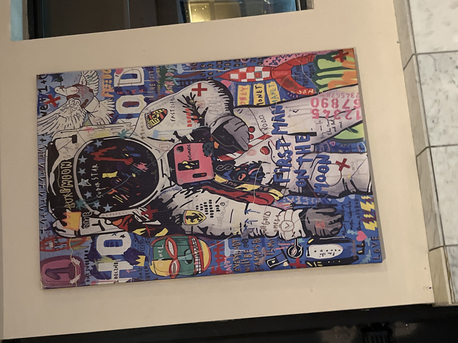 The image presents a colorful, collage-style artwork featuring an astronaut as the central figure. Bold, graffiti-like words and phrases like "LUXGMOON," "SUPER STAR," "FIRST MAN ON THE MOON," "FAST LIFE," and "MONEY PLANET" are scattered around the astronaut. The composition incorporates a variety of elements, including numbers, stars, cartoonish images, and corporate logos, creating a visually busy and layered aesthetic. The artwork appears to be a blend of pop art, street art, and commercial imagery.