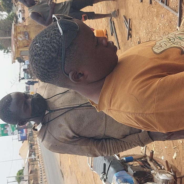 An outdoor scene features two individuals. A young person with dark hair and sunglasses is in focus, wearing an orange shirt with a visible design. Behind them stands another individual wearing a brown hoodie and a black face mask. A motorcycle is partially visible in the foreground, parked on a dirt surface. The background reveals a street with buildings and what appears to be a political campaign sign. The atmosphere seems casual and could be a street scene in a developing country.
