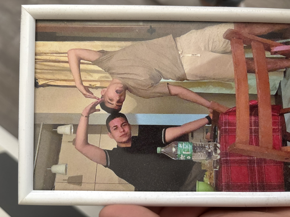 A photograph, encased in a white frame and held by fingers on the left, depicts two young males indoors in Mirovyane, Bulgaria
