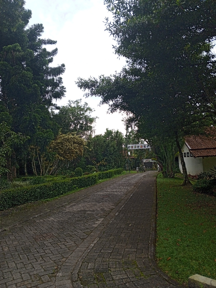 A narrow paved road lined with greenery leads into a park or estate. Tall trees flank both sides, casting shadows on the cobblestone path. A trimmed hedge runs along the left side. A white building with a tiled roof is partially visible on the right. At the end of the road, a sign or structure indicates the entrance. The sky is overcast, creating soft, diffused lighting.