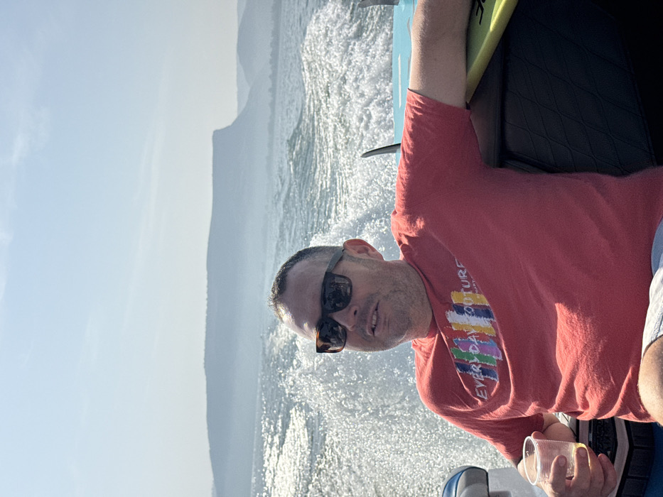A male individual is depicted in a moving recreational boat on the Sea of Galilee, near Migdal, Israel. The Caucasian male, approximately 30-40 years old, has short dark hair and stubble, wears dark sunglasses and a red short-sleeved t-shirt with a "EVERYDAY COUTURE" graphic featuring vertical colored stripes. He is seated, holding a clear plastic cup containing an amber liquid in his left hand. His right arm rests on a padded backrest. Behind him, boat spray and wake are visible on the water surface. A yellow-green surfboard or wakeboard with a fin is positioned to his right on the boat's interior. In the background, a body of water extends to the horizon, with hazy, undulating mountains or hills visible under a clear, bright sky.