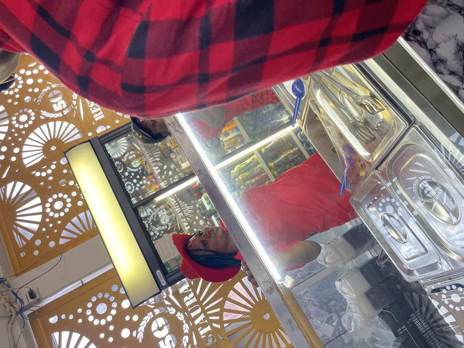 An indoor scene in a restaurant in Jama A, Nigeria, captured from a slightly high and tilted perspective, focuses on a food service counter. In the immediate foreground, the back and right shoulder of an individual wearing a red and black plaid shirt are visible, positioned as if facing the counter. Behind the counter, a female individual with dark braided hair, wearing a red short-sleeved top and a red cowboy-style hat adorned with studs, is visible from the chest up. She is looking towards the left side of the frame. Directly behind her, a large glass-fronted commercial refrigerator is stocked with various bottled beverages and packaged goods. Reflected in the refrigerator glass, the upper face of a second individual wearing a dark baseball cap is faintly discernible. The counter itself features a fluorescent light strip illuminating several stainless steel food service trays. Some trays are covered, while one open tray contains a purple-hued dish, and another holds metal tongs and a blue serving spoon. To the left, behind the counter's glass, multiple white plastic bags are stacked. The background wall is decorated with yellow panels featuring intricate, laser-cut patterns of concentric circles and radial lines. Textual elements "5G" and "RESTAURA" are visible on these panels, suggesting "5G Restaurant" or "50 Restaurant". Overhead, electrical wiring is visible on the ceiling. A fragment of a black and white marble-patterned floor is visible in the bottom right corner.