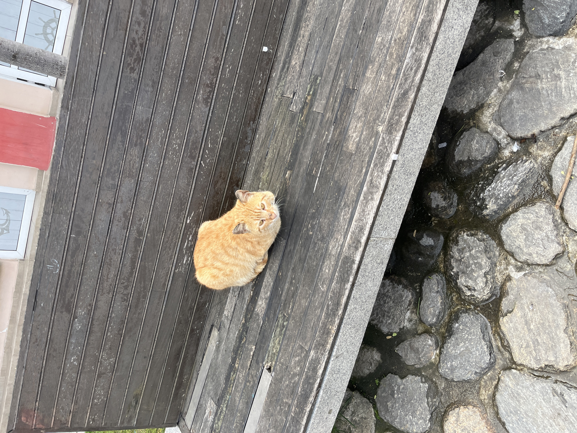 An orange tabby cat is sitting on a weathered wooden bench. To the right of the bench, a stone embankment with water is visible. To the left of the bench, there is a building with orange and white walls and windows. The image appears to be taken from an elevated perspective. It is not possible to verify the location of the city of Tsarevo, Bulgaria, based on the provided image.