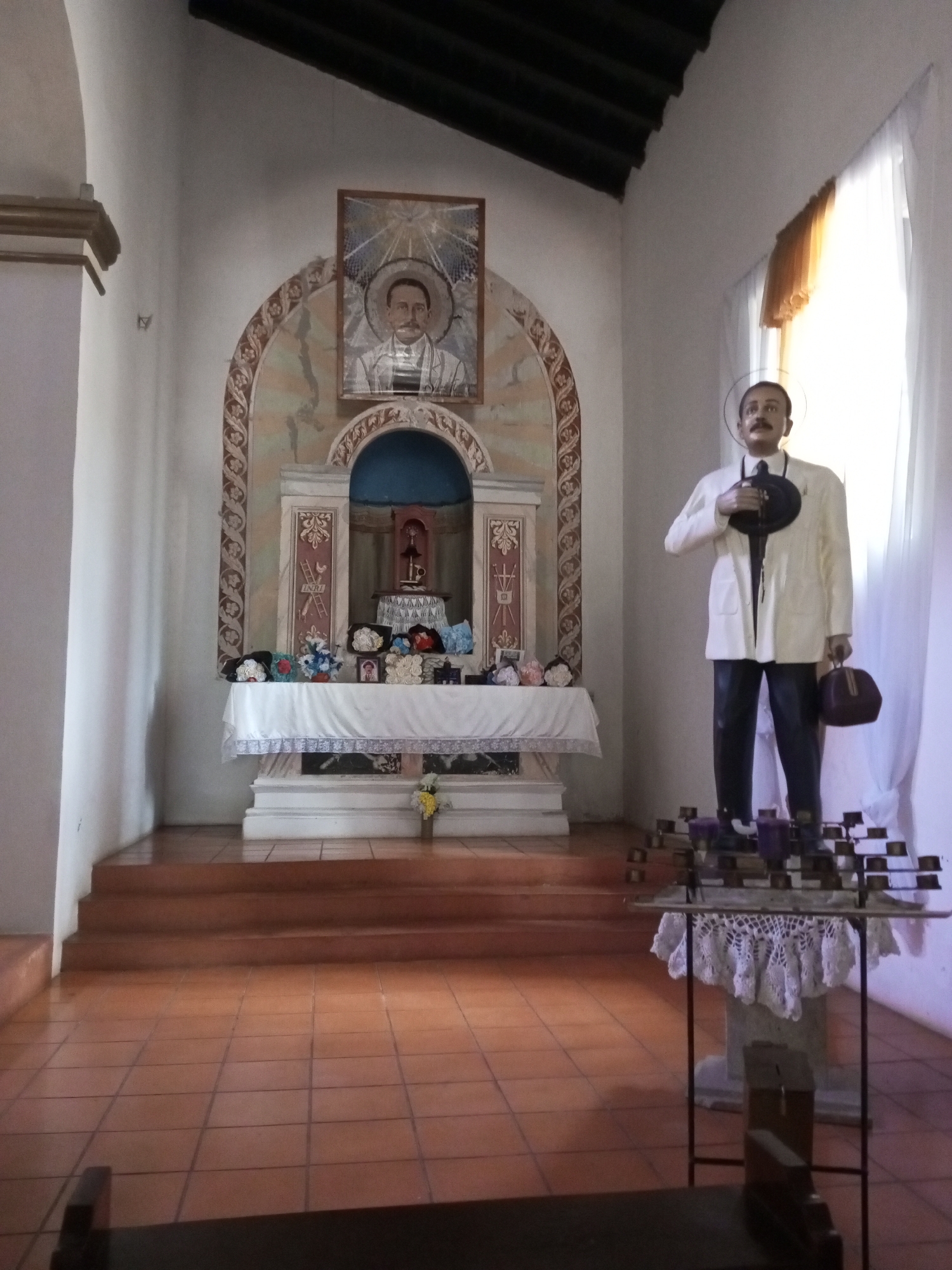 The image depicts the interior of the Church of El Pao in El Pao, Venezuela. An altar is elevated on a platform with multiple steps. A painting of a man hangs above the altar. Numerous small objects, including flowers and hats, are arranged on the altar. To the right of the altar stands a statue of a man wearing a light-colored jacket, dark pants, and holding a hat and bag. In front of the statue is a table with candles. The room is tiled with reddish-brown tiles. Light streams in through a window on the right side of the image.