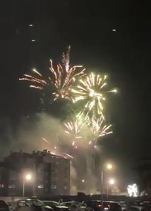 The video depicts a nighttime fireworks display over a town or city