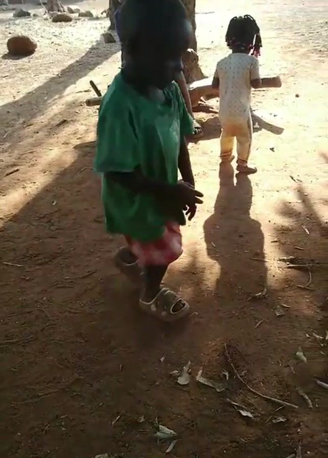 four young children playing outdoors on a dirt surface with scattered leaves and small debris. A young boy in a green t-shirt and red and white checkered shorts is the main focus. He wears sandals and shuffles his feet while looking down. A girl in a pink dress and sandals stands next to him. Another younger girl is holding a small stick and plays nearby. An adult woman is sitting on a bench or log under a tree, watching the children. The background includes simple buildings, a motorcycle, and a tree that casts long shadows on the ground. The lighting suggests it's either early morning or late afternoon, casting a warm glow over the scene.