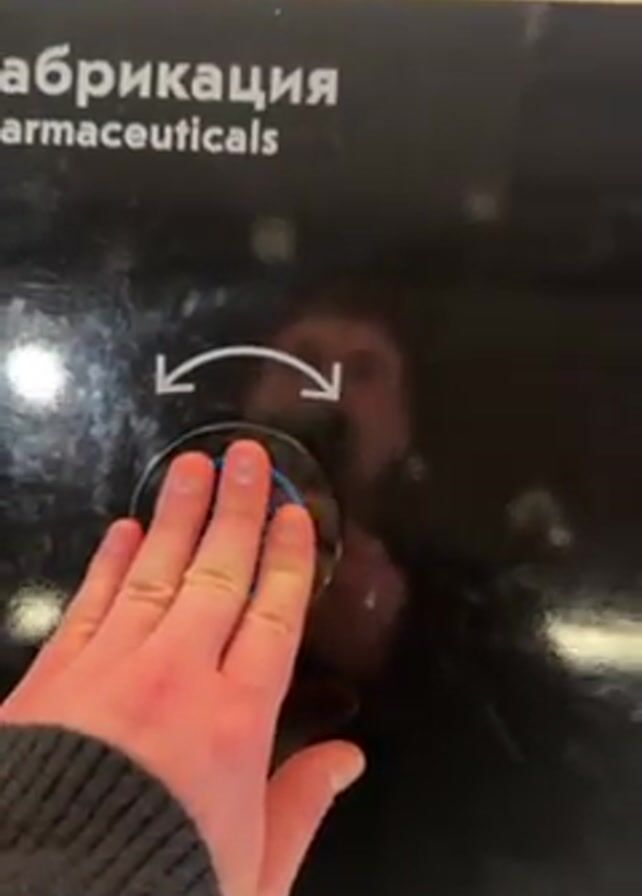 A person presses a round, glass-covered button with a blue illuminated border on a black panel with white text saying "абрикация" and "Pharmaceuticals