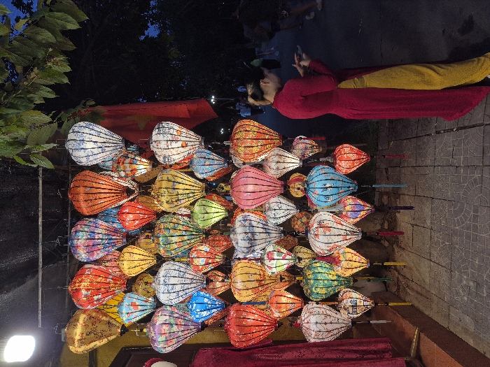 - "An evening scene in Hội An Ward, Vietnam, depicts a dense vertical display of approximately fifty illuminated, colorful lanterns of varying patterns, primarily teardrop-shaped, hanging above a dark gray paved pathway" by FM-vOprn2, licensed under CC BY 4.0