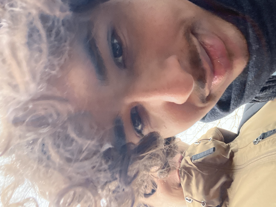 This close-up image, purportedly taken in Meistratzheim, France, captures two individuals outdoors. The foreground, occupying the right side of the frame, shows an individual with medium-dark skin, dark curly hair, and a mustache, looking directly at the camera with a closed-mouth smile. This person wears a dark, ribbed scarf. Partially visible behind and to the left of the foreground subject is a second individual. Only the upper portion of this second person is discernible, including curly hair, a section of their face showing the chin and mouth, and the collar and upper chest of a light brown jacket featuring silver grommets and dark zippers. The background is a bright, out-of-focus expanse with faint outlines of bare tree branches.