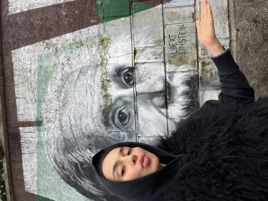 An adult female, wearing a black hooded top and a black shaggy/furry vest, is depicted in a selfie-style photograph in Grad Opatija, Croatia. She is positioned in front of a weathered concrete or stucco wall featuring a monochromatic mural of Albert Einstein. The woman has dark hair covered by her hood, her head is tilted slightly, and her lips are puckered. Her left arm is extended outwards to the right, with the palm open and facing forward; a silver-colored bracelet is visible on her left wrist. The mural portrays Einstein's face and upper torso, rendered in shades of black, white, and grey. The wall exhibits signs of aging, including cracks, textured surfaces, and patches of moss growth, particularly around the eye area of the mural. The name "ALBERT EINSTEIN" is painted in black, dripping letters below the mural's face, towards the lower right. Above the Einstein mural, geometric shapes in green and brown paint are present on the upper section of the wall, with visible paint drips.