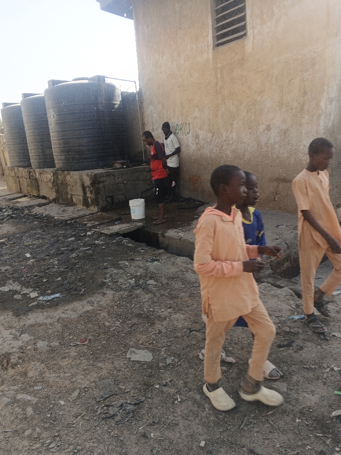 This image depicts a dusty street scene in Gobirawa, Nigeria, under bright daylight. In the mid-ground, a row of at least four large, black cylindrical water storage tanks stands on a raised concrete platform. Adjacent to these tanks is a light-colored building with a single rectangular window fitted with horizontal bars. Three adult males are positioned near the water tanks. One male, wearing a red short-sleeved shirt and dark shorts, stands next to a white bucket, appearing to be engaged with a water tap connected to the tanks, suggesting water collection. To his right, another male in a white short-sleeved shirt and a dark beanie leans against the building wall. A third male, partially obscured, stands behind the individual in the white shirt, also near the wall. In the foreground and mid-ground, three children are walking from right to left across the frame. The most prominent child, positioned centrally, wears a light orange long-sleeved tunic and matching trousers, with light-colored slip-on shoes. To his immediate left and slightly behind him, a second child is partially visible, wearing a blue shirt. Further to the right, a third child, also dressed in a light orange tunic and trousers, walks with dark sandals on his feet. The ground is unpaved, consisting of dry earth and scattered debris, including plastic and paper. A partially covered concrete drainage ditch or gutter runs across the mid-ground, separating the walking children from the adults and water tanks. The scene suggests daily activities related to water access and pedestrian movement in the community.