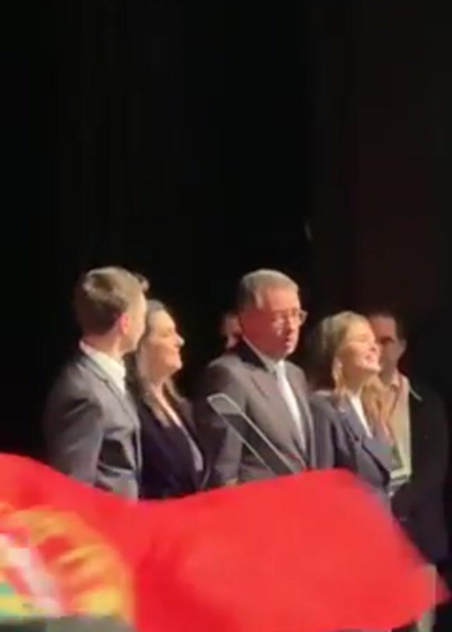 group of people standing on a stage in front of a dark background. A man in a dark suit and tie is speaking at a podium. To his left are a young man and a woman, both also in dark suits. To his right are a young woman in a dark suit and another man. The audience can be seen in the lower right corner of the frame.