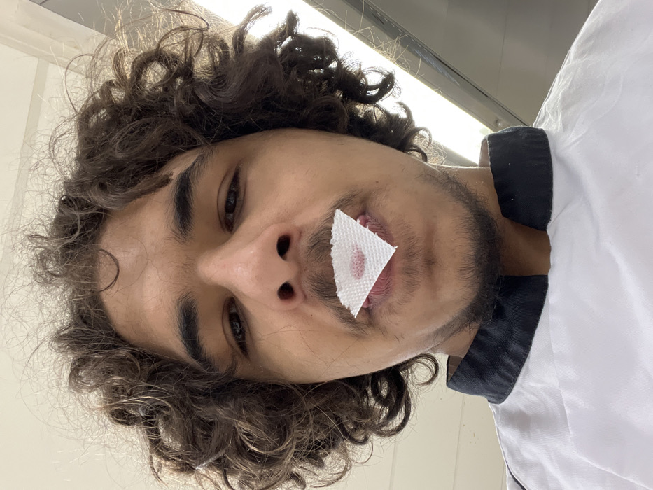 A close-up, tilted portrait features a young man with curly brown hair. He's wearing a white martial arts uniform with black trim at the neck. A small, white triangular piece of tissue is held against his lip, showing a small amount of blood. He has dark eyes and a light beard. The background is blurred, but a light fixture suggests an indoor setting.
