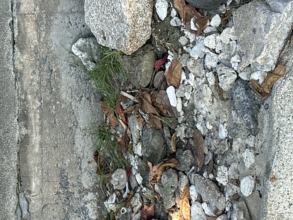A narrow drainage ditch is partially filled with debris. Large rocks and smaller stones, some white, fill the space. Dead leaves and a small patch of green grass are also visible among the rocks. Concrete forms the side walls of the ditch, with a weathered, textured surface. The overall scene suggests a neglected or forgotten corner.