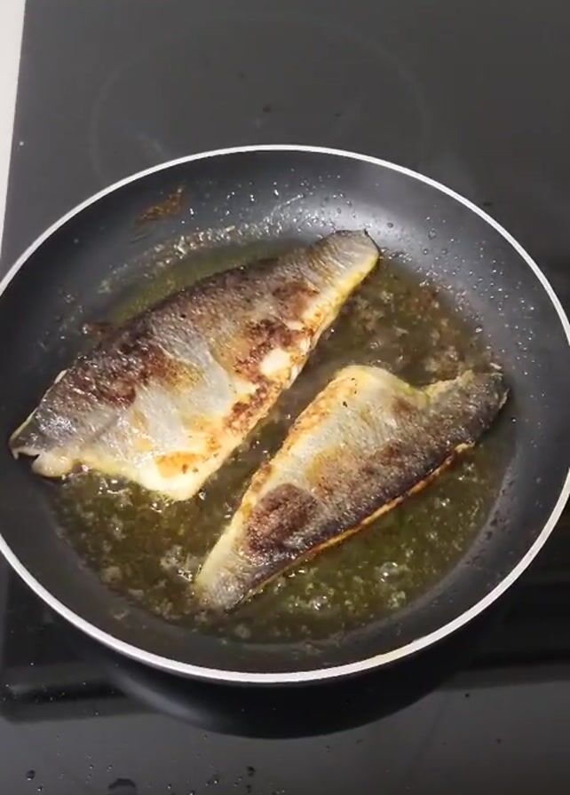 two fish fillets frying in a pan with oil on a black Balay induction cooktop