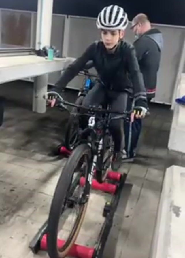 two young people riding bicycles on trainers. One is a boy wearing a white helmet, dark jacket, and black pants riding a black mountain bike on red and black rollers. Another person stands behind him and to the side. The camera moves to show a bald man in a black coat. Next, the camera moves to a girl with braids and an orange and white shirt who is also on a trainer. She is riding a gray bicycle. They appear to be in an indoor training area, likely for cyclists. There are tables and benches nearby.