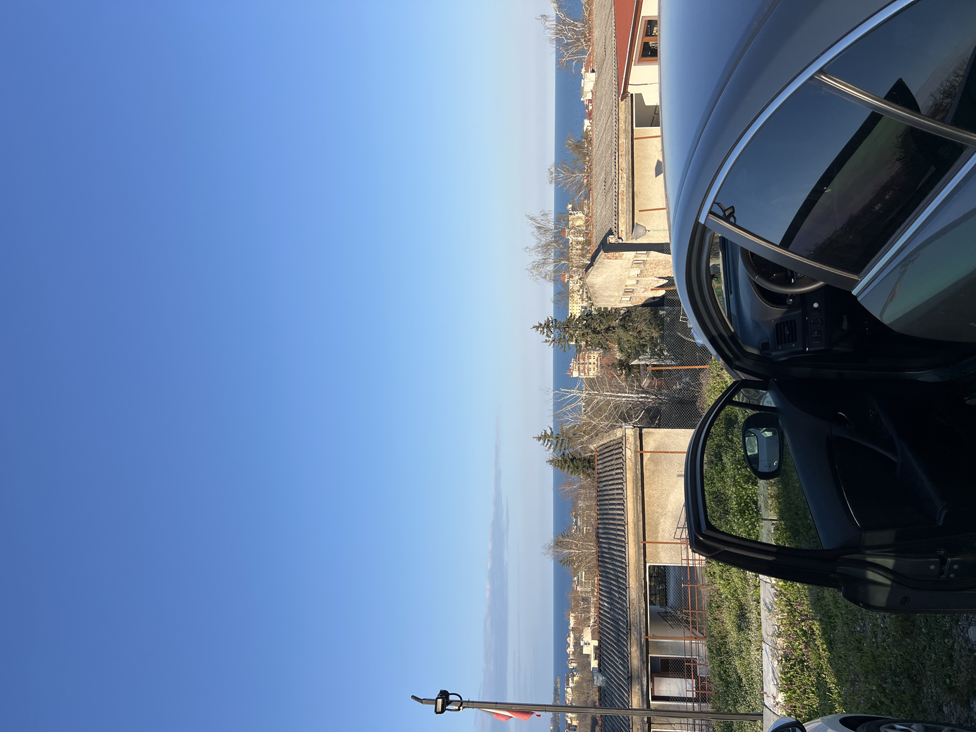 view from what appears to be a high vantage point in the city of Obzor, Bulgaria, looking towards the sea. The sky is clear and blue, taking up a significant portion of the frame. Below the sky, a line of buildings and foliage separates it from the water. The sea is a lighter blue, and the coastline of Obzor is visible. In the foreground, the open door of a dark-colored car is prominent, with details like the window frame, door panel, and rearview mirror visible. The car itself occupies the right side of the image. A portion of a building and some greenery are also present in the immediate foreground near the car. There is a pole with a flag mounted on it. The overall scene suggests a bright, sunny day by the sea.