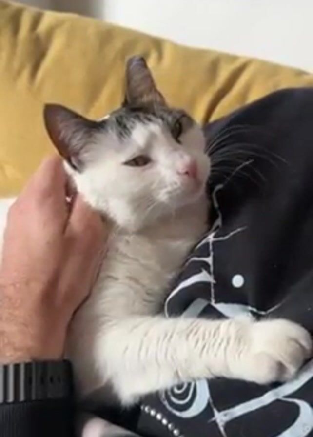 A person is sitting with a white cat with gray markings lying on their lap. The person is wearing a black sweatshirt with white designs on it. The cat has its eyes partially closed and appears relaxed as the person gently strokes its neck. The background includes a yellow pillow. A black object with a textured surface is visible near the person's wrist.