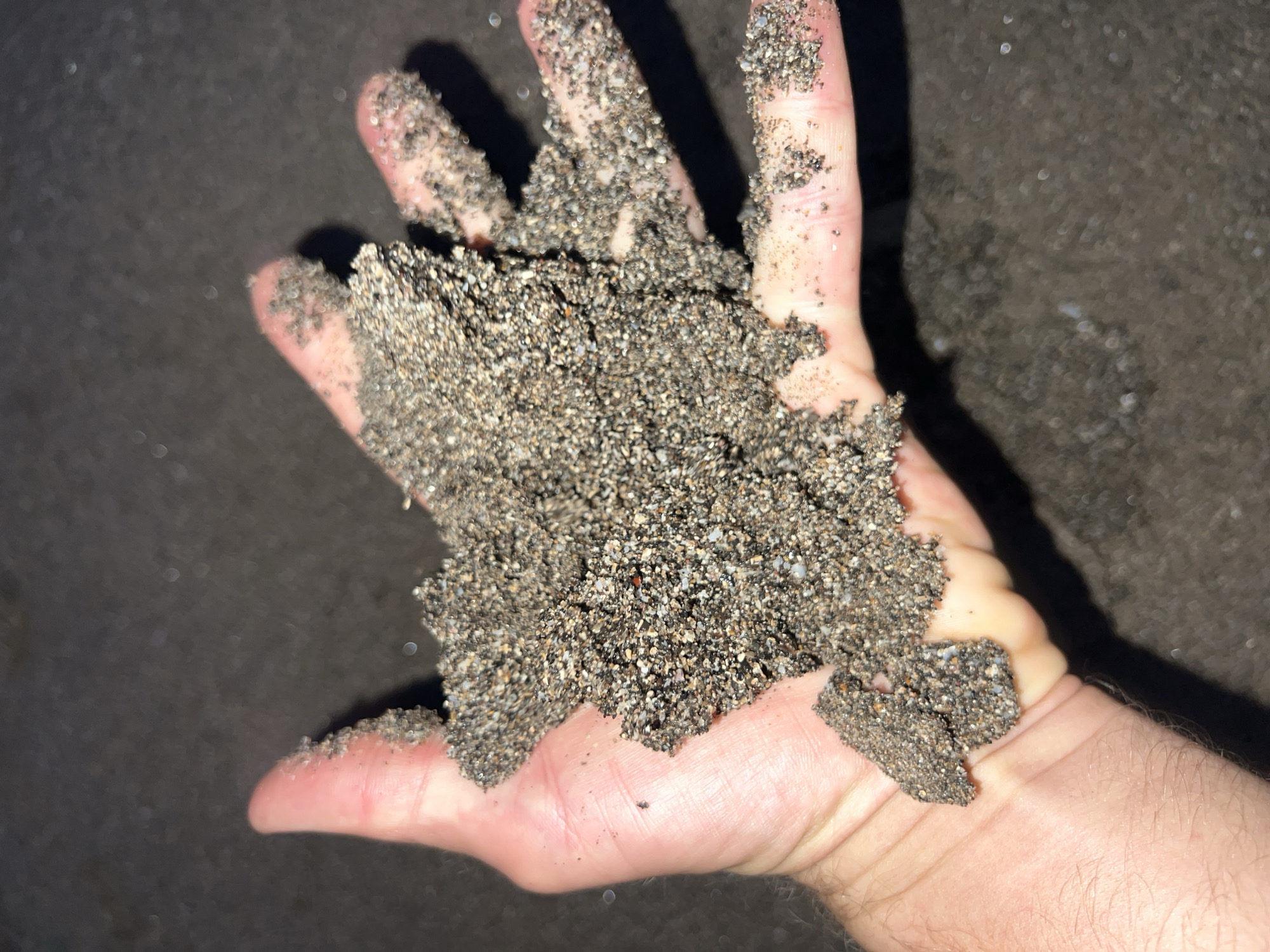- "A close-up, high-angle view depicts a light-skinned human hand, exhibiting faint hair on the wrist, cupping a substantial amount of dark, granular sand" by FM-xgQP92, licensed under CC BY 4.0