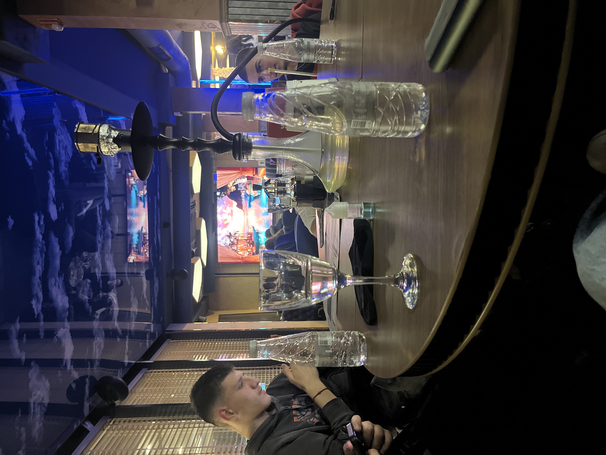 The scene depicts a dimly lit shisha lounge or cafe located in Pernik, Bulgaria. A large, dark wooden round table occupies the foreground and midground. Centrally positioned on the table is a black hookah with a clear glass base, containing liquid and a black hose. Its bowl is wrapped in aluminum foil. To the left of the hookah, a clear wine glass, partially filled with liquid, stands alongside a small transparent dropper bottle containing light blue liquid. Three clear plastic bottles of water are distributed across the table; one has a blue cap, another a grey cap. A dark fabric item lies beneath the wine glass, and a metallic object rests on the right edge of the table. Two young males are seated at the table. The male on the left, with short dark hair, wears a dark hoodie and a red bracelet on his right wrist. He is actively operating a smartphone held in both hands, looking down at the screen. The male on the right, partially obscured by the hookah, also has dark hair and wears a dark garment with red detailing. He looks towards the left, holding a light-colored object, consistent with a shisha mouthpiece, near his mouth. The environment features a dark blue ceiling painted with white clouds, which reflects ambient light and portions of the room. Blinds cover a vertical window or partition on the far left. In the deeper background, a large screen or illuminated artwork displays a vibrant, colorful landscape scene. Blurred figures are visible seated further back in the venue. Blue accent lighting is integrated into the overhead structure.