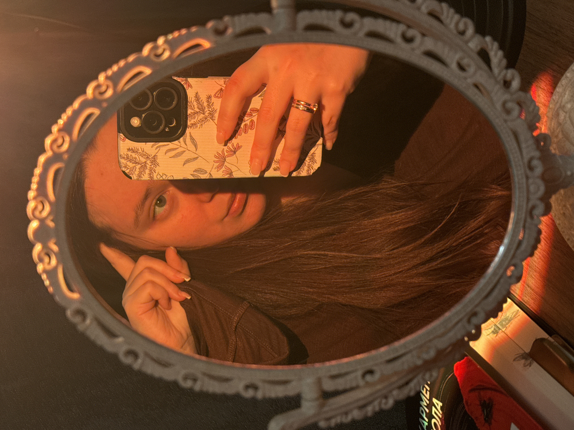 A young woman takes a selfie in a decorative oval mirror