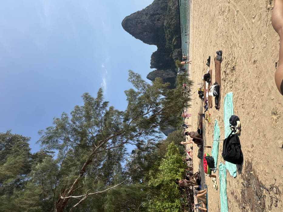 The image captures a vibrant daytime beach scene at Ban Ao Nang, Thailand, under a clear blue sky with minimal cloud cover. The foreground consists of light brown sand, partially shaded on the left by the dense green foliage and branches of large trees. In the immediate lower right foreground, the lower back and buttocks of a person are visible, indicating they are lying prone on the sand. Across the mid-ground, numerous individuals are present on the beach. One person is seen lying on a light blue towel, engaged with a device. Nearby, two individuals sit on the sand; one wears dark shorts, the other appears shirtless, positioned near a dark backpack, several pairs of sandals, a brown bottle, and a red cup. Other beachgoers are scattered throughout the sandy area, some resting under the shade of trees, others exposed to direct sunlight, wearing swimsuits and casual attire. Actions observed include resting, walking, and sunbathing. The background features clear, turquoise ocean water with a line of traditional longtail boats anchored further out. Several people are visible in the water or at the water's edge. Dominating the distant background are large, imposing limestone karsts, dark grey in color with visible patches of vegetation, rising sharply from the land and sea, a defining characteristic of the region. The overall scene indicates a busy, recreational beach environment.