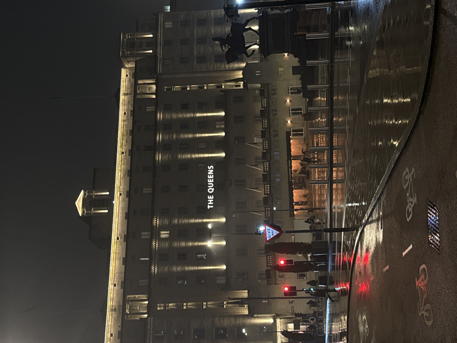 A tall building with "THE QUEENS" written on its facade is illuminated at night
